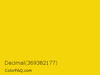 Decimal 369382177 Color is a normal yellow color and the nearest color is Safety Yellow #eed202. Hex code #f4d509 and RGB value is rgb(244,213,9). In RGB color space, this color is composed of 96% red, 84% green, 4% blue, In CMYK color space, this color is composed of 0% cyan, 13% magenta, 96% yellow , 4% black , In HSL color space, this color has a hue angle of 52° , 93% saturation and 50% lightness.