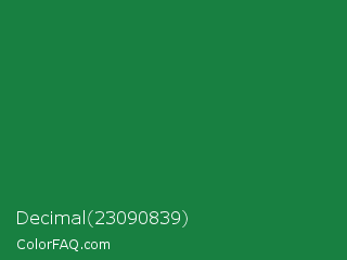 Decimal 23090839 Color is a dark green color and the nearest color is Dark Spring Green #177245. Hex code #188041 and RGB value is rgb(24,128,65). In RGB color space, this color is composed of 9% red, 50% green, 25% blue, In CMYK color space, this color is composed of 81% cyan, 0% magenta, 49% yellow , 50% black , In HSL color space, this color has a hue angle of 144° , 68% saturation and 30% lightness.