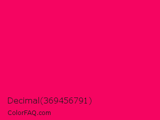 Decimal 369456791 Color is a normal rose color and the nearest color is Vivid Raspberry #ff006c. Hex code #f50561 and RGB value is rgb(245,5,97). In RGB color space, this color is composed of 96% red, 2% green, 38% blue, In CMYK color space, this color is composed of 0% cyan, 98% magenta, 60% yellow , 4% black , In HSL color space, this color has a hue angle of 337° , 96% saturation and 49% lightness.
