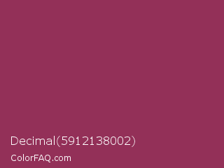 Decimal 5912138002 Color is a normal rose color and the nearest color is Camelot #893456. Hex code #933058 and RGB value is rgb(147,48,88). In RGB color space, this color is composed of 58% red, 19% green, 35% blue, In CMYK color space, this color is composed of 0% cyan, 67% magenta, 40% yellow , 42% black , In HSL color space, this color has a hue angle of 336° , 51% saturation and 38% lightness.