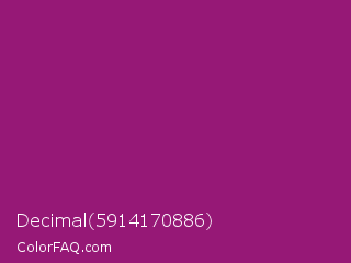 Decimal 5914170886 Color is a normal magenta color and the nearest color is Amaranth Deep Purple #9f2b68. Hex code #961876 and RGB value is rgb(150,24,118). In RGB color space, this color is composed of 59% red, 9% green, 46% blue, In CMYK color space, this color is composed of 0% cyan, 84% magenta, 21% yellow , 41% black , In HSL color space, this color has a hue angle of 315° , 72% saturation and 34% lightness.