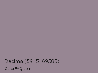 Decimal 5915169585 Color is a normal magenta color and the nearest color is Venus #928590. Hex code #978693 and RGB value is rgb(151,134,147). In RGB color space, this color is composed of 59% red, 53% green, 58% blue, In CMYK color space, this color is composed of 0% cyan, 11% magenta, 3% yellow , 41% black , In HSL color space, this color has a hue angle of 314° , 8% saturation and 56% lightness.