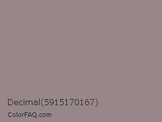 Decimal 5915170167 Color is a normal red color and the nearest color is Venus #928590. Hex code #978789 and RGB value is rgb(151,135,137). In RGB color space, this color is composed of 59% red, 53% green, 54% blue, In CMYK color space, this color is composed of 0% cyan, 11% magenta, 9% yellow , 41% black , In HSL color space, this color has a hue angle of 353° , 7% saturation and 56% lightness.
