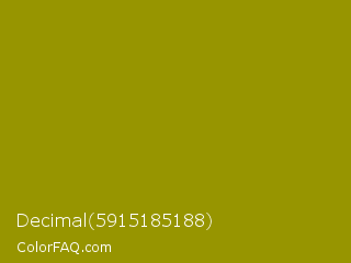 Decimal 5915185188 Color is a dark yellow color and the nearest color is Dark Yellow #9b870c. Hex code #979500 and RGB value is rgb(151,149,0). In RGB color space, this color is composed of 59% red, 58% green, 0% blue, In CMYK color space, this color is composed of 0% cyan, 1% magenta, 100% yellow , 41% black , In HSL color space, this color has a hue angle of 59° , 100% saturation and 30% lightness.