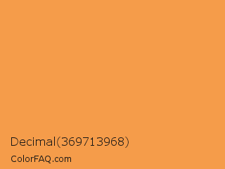 Decimal 369713968 Color is a light orange color and the nearest color is Neon Carrot #ffa343. Hex code #f59c4a and RGB value is rgb(245,156,74). In RGB color space, this color is composed of 96% red, 61% green, 29% blue, In CMYK color space, this color is composed of 0% cyan, 36% magenta, 70% yellow , 4% black , In HSL color space, this color has a hue angle of 29° , 90% saturation and 63% lightness.
