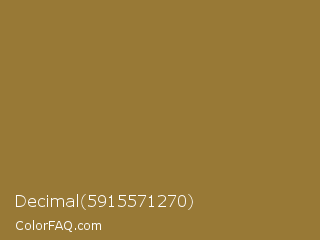 Decimal 5915571270 Color is a normal orange color and the nearest color is Metallic Sunburst #9c7c38. Hex code #987936 and RGB value is rgb(152,121,54). In RGB color space, this color is composed of 60% red, 47% green, 21% blue, In CMYK color space, this color is composed of 0% cyan, 20% magenta, 64% yellow , 40% black , In HSL color space, this color has a hue angle of 41° , 48% saturation and 40% lightness.