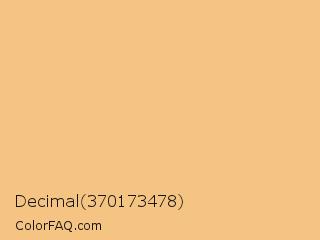 Decimal 370173478 Color is a light orange color and the nearest color is Topaz #ffc87c. Hex code #f5c482 and RGB value is rgb(245,196,130). In RGB color space, this color is composed of 96% red, 77% green, 51% blue, In CMYK color space, this color is composed of 0% cyan, 20% magenta, 47% yellow , 4% black , In HSL color space, this color has a hue angle of 34° , 85% saturation and 74% lightness.