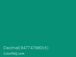 Decimal 94774768016 Color is a dark cyan color and the nearest color is Paolo Veronese Green #009b7d. Hex code #069176 and RGB value is rgb(6,145,118). In RGB color space, this color is composed of 2% red, 57% green, 46% blue, In CMYK color space, this color is composed of 96% cyan, 0% magenta, 19% yellow , 43% black , In HSL color space, this color has a hue angle of 168° , 92% saturation and 30% lightness.