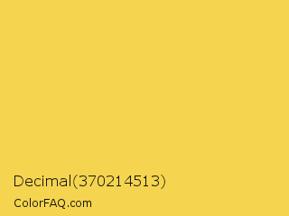 Decimal 370214513 Color is a light yellow color and the nearest color is Minion Yellow #f5e050. Hex code #f5d44f and RGB value is rgb(245,212,79). In RGB color space, this color is composed of 96% red, 83% green, 31% blue, In CMYK color space, this color is composed of 0% cyan, 13% magenta, 68% yellow , 4% black , In HSL color space, this color has a hue angle of 48° , 89% saturation and 64% lightness.