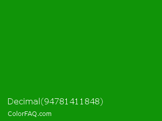Decimal 94781411848 Color is a normal green color and the nearest color is India Green #138808. Hex code #109408 and RGB value is rgb(16,148,8). In RGB color space, this color is composed of 6% red, 58% green, 3% blue, In CMYK color space, this color is composed of 89% cyan, 0% magenta, 95% yellow , 42% black , In HSL color space, this color has a hue angle of 117° , 90% saturation and 31% lightness.