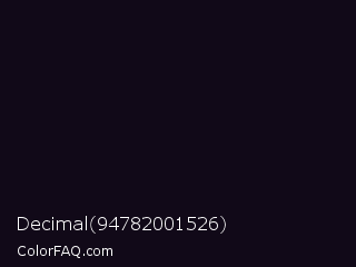 Decimal 94782001526 Color is a almost black purple color and the nearest color is Cinder #0e0e18. Hex code #110918 and RGB value is rgb(17,9,24). In RGB color space, this color is composed of 7% red, 4% green, 9% blue, In CMYK color space, this color is composed of 29% cyan, 63% magenta, 0% yellow , 91% black , In HSL color space, this color has a hue angle of 272° , 45% saturation and 6% lightness.