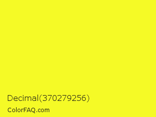 Decimal 370279256 Color is a normal yellow color and the nearest color is Daffodil #ffff31. Hex code #f5fa26 and RGB value is rgb(245,250,38). In RGB color space, this color is composed of 96% red, 98% green, 15% blue, In CMYK color space, this color is composed of 2% cyan, 0% magenta, 85% yellow , 2% black , In HSL color space, this color has a hue angle of 61° , 95% saturation and 56% lightness.