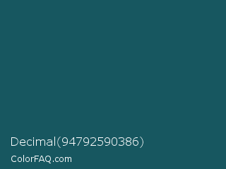 Decimal 94792590386 Color is a dark cyan color and the nearest color is Eden #105852. Hex code #175760 and RGB value is rgb(23,87,96). In RGB color space, this color is composed of 9% red, 34% green, 38% blue, In CMYK color space, this color is composed of 76% cyan, 9% magenta, 0% yellow , 62% black , In HSL color space, this color has a hue angle of 187° , 61% saturation and 23% lightness.