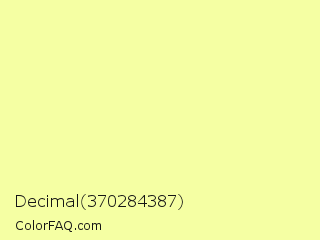 Decimal 370284387 Color is a very light yellow color and the nearest color is Milan #faffa4. Hex code #f5ffa3 and RGB value is rgb(245,255,163). In RGB color space, this color is composed of 96% red, 100% green, 64% blue, In CMYK color space, this color is composed of 4% cyan, 0% magenta, 36% yellow , 0% black , In HSL color space, this color has a hue angle of 67° , 100% saturation and 82% lightness.