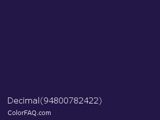 Decimal 94800782422 Color is a very dark indigo color and the nearest color is Valhalla #2b194f. Hex code #231748 and RGB value is rgb(35,23,72). In RGB color space, this color is composed of 14% red, 9% green, 28% blue, In CMYK color space, this color is composed of 51% cyan, 68% magenta, 0% yellow , 72% black , In HSL color space, this color has a hue angle of 255° , 52% saturation and 19% lightness.