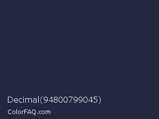 Decimal 94800799045 Color is a very dark blue color and the nearest color is Ebony Clay #26283b. Hex code #232741 and RGB value is rgb(35,39,65). In RGB color space, this color is composed of 14% red, 15% green, 25% blue, In CMYK color space, this color is composed of 46% cyan, 40% magenta, 0% yellow , 75% black , In HSL color space, this color has a hue angle of 232° , 30% saturation and 20% lightness.