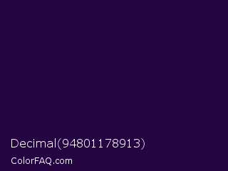 Decimal 94801178913 Color is a very dark purple color and the nearest color is Violet #240a40. Hex code #240441 and RGB value is rgb(36,4,65). In RGB color space, this color is composed of 14% red, 2% green, 25% blue, In CMYK color space, this color is composed of 45% cyan, 94% magenta, 0% yellow , 75% black , In HSL color space, this color has a hue angle of 271° , 88% saturation and 14% lightness.