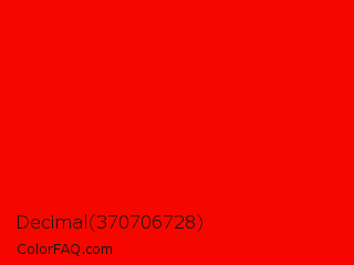 Decimal 370706728 Color is a normal red color and the nearest color is Candy Apple Red #ff0800. Hex code #f70600 and RGB value is rgb(247,6,0). In RGB color space, this color is composed of 97% red, 2% green, 0% blue, In CMYK color space, this color is composed of 0% cyan, 98% magenta, 100% yellow , 3% black , In HSL color space, this color has a hue angle of 1° , 100% saturation and 48% lightness.