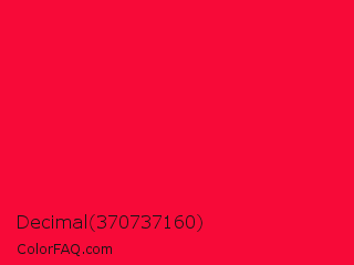 Decimal 370737160 Color is a normal red color and the nearest color is Torch Red #fd0e35. Hex code #f70a38 and RGB value is rgb(247,10,56). In RGB color space, this color is composed of 97% red, 4% green, 22% blue, In CMYK color space, this color is composed of 0% cyan, 96% magenta, 77% yellow , 3% black , In HSL color space, this color has a hue angle of 348° , 94% saturation and 50% lightness.