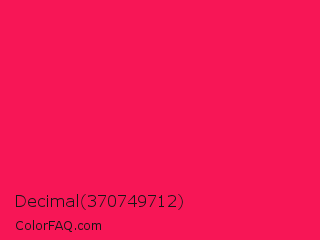 Decimal 370749712 Color is a normal rose color and the nearest color is Awesome #ff2052. Hex code #f71656 and RGB value is rgb(247,22,86). In RGB color space, this color is composed of 97% red, 9% green, 34% blue, In CMYK color space, this color is composed of 0% cyan, 91% magenta, 65% yellow , 3% black , In HSL color space, this color has a hue angle of 343° , 93% saturation and 53% lightness.