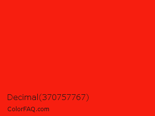 Decimal 370757767 Color is a normal red color and the nearest color is Red RYB #fe2712. Hex code #f71e0f and RGB value is rgb(247,30,15). In RGB color space, this color is composed of 97% red, 12% green, 6% blue, In CMYK color space, this color is composed of 0% cyan, 88% magenta, 94% yellow , 3% black , In HSL color space, this color has a hue angle of 4° , 94% saturation and 51% lightness.