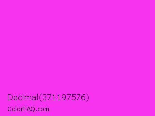 Decimal 371197576 Color is a normal magenta color and the nearest color is Purple Pizzazz #fe4eda. Hex code #f733f0 and RGB value is rgb(247,51,240). In RGB color space, this color is composed of 97% red, 20% green, 94% blue, In CMYK color space, this color is composed of 0% cyan, 79% magenta, 3% yellow , 3% black , In HSL color space, this color has a hue angle of 302° , 92% saturation and 58% lightness.