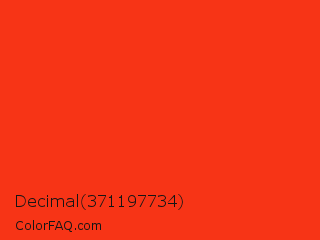 Decimal 371197734 Color is a normal red color and the nearest color is Red RYB #fe2712. Hex code #f73416 and RGB value is rgb(247,52,22). In RGB color space, this color is composed of 97% red, 20% green, 9% blue, In CMYK color space, this color is composed of 0% cyan, 79% magenta, 91% yellow , 3% black , In HSL color space, this color has a hue angle of 8° , 93% saturation and 53% lightness.