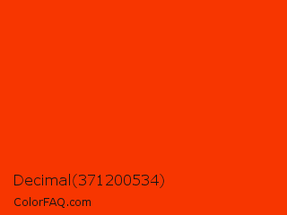Decimal 371200534 Color is a normal red color and the nearest color is Coquelicot #ff3800. Hex code #f73600 and RGB value is rgb(247,54,0). In RGB color space, this color is composed of 97% red, 21% green, 0% blue, In CMYK color space, this color is composed of 0% cyan, 78% magenta, 100% yellow , 3% black , In HSL color space, this color has a hue angle of 13° , 100% saturation and 48% lightness.