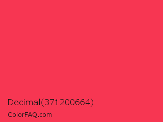 Decimal 371200664 Color is a normal red color and the nearest color is Sizzling Red #ff3855. Hex code #f73652 and RGB value is rgb(247,54,82). In RGB color space, this color is composed of 97% red, 21% green, 32% blue, In CMYK color space, this color is composed of 0% cyan, 78% magenta, 67% yellow , 3% black , In HSL color space, this color has a hue angle of 351° , 92% saturation and 59% lightness.
