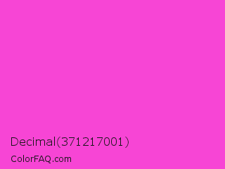 Decimal 371217001 Color is a light magenta color and the nearest color is Purple Pizzazz #fe4eda. Hex code #f745d5 and RGB value is rgb(247,69,213). In RGB color space, this color is composed of 97% red, 27% green, 84% blue, In CMYK color space, this color is composed of 0% cyan, 72% magenta, 14% yellow , 3% black , In HSL color space, this color has a hue angle of 311° , 92% saturation and 62% lightness.