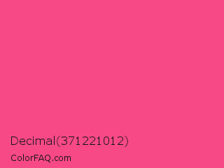 Decimal 371221012 Color is a light rose color and the nearest color is French Rose #f64a8a. Hex code #f74986 and RGB value is rgb(247,73,134). In RGB color space, this color is composed of 97% red, 29% green, 53% blue, In CMYK color space, this color is composed of 0% cyan, 70% magenta, 46% yellow , 3% black , In HSL color space, this color has a hue angle of 339° , 92% saturation and 63% lightness.