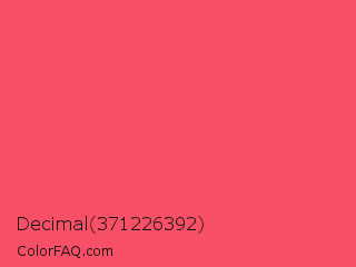 Decimal 371226392 Color is a light red color and the nearest color is Infra Red #ff496c. Hex code #f74f66 and RGB value is rgb(247,79,102). In RGB color space, this color is composed of 97% red, 31% green, 40% blue, In CMYK color space, this color is composed of 0% cyan, 68% magenta, 59% yellow , 3% black , In HSL color space, this color has a hue angle of 352° , 91% saturation and 64% lightness.
