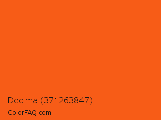 Decimal 371263847 Color is a normal orange color and the nearest color is Giants Orange #fe5a1d. Hex code #f75c17 and RGB value is rgb(247,92,23). In RGB color space, this color is composed of 97% red, 36% green, 9% blue, In CMYK color space, this color is composed of 0% cyan, 63% magenta, 91% yellow , 3% black , In HSL color space, this color has a hue angle of 18° , 93% saturation and 53% lightness.