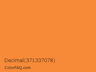 Decimal 371337078 Color is a normal orange color and the nearest color is Jaffa #ef863f. Hex code #f78a38 and RGB value is rgb(247,138,56). In RGB color space, this color is composed of 97% red, 54% green, 22% blue, In CMYK color space, this color is composed of 0% cyan, 44% magenta, 77% yellow , 3% black , In HSL color space, this color has a hue angle of 26° , 92% saturation and 59% lightness.