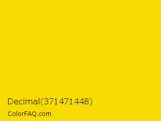 Decimal 371471448 Color is a normal yellow color and the nearest color is Sizzling Sunrise #ffdb00. Hex code #f7db02 and RGB value is rgb(247,219,2). In RGB color space, this color is composed of 97% red, 86% green, 1% blue, In CMYK color space, this color is composed of 0% cyan, 11% magenta, 99% yellow , 3% black , In HSL color space, this color has a hue angle of 53° , 98% saturation and 49% lightness.