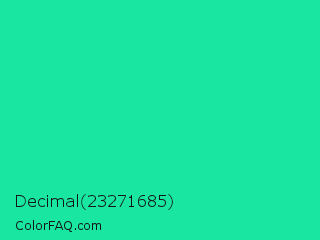 Decimal 23271685 Color is a normal green color and the nearest color is Medium Spring Green #00fa9a. Hex code #18e6a1 and RGB value is rgb(24,230,161). In RGB color space, this color is composed of 9% red, 90% green, 63% blue, In CMYK color space, this color is composed of 90% cyan, 0% magenta, 30% yellow , 10% black , In HSL color space, this color has a hue angle of 160° , 81% saturation and 50% lightness.