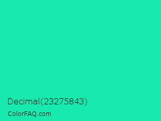 Decimal 23275843 Color is a normal green color and the nearest color is Medium Spring Green #00fa9a. Hex code #18eaaf and RGB value is rgb(24,234,175). In RGB color space, this color is composed of 9% red, 92% green, 69% blue, In CMYK color space, this color is composed of 90% cyan, 0% magenta, 25% yellow , 8% black , In HSL color space, this color has a hue angle of 163° , 83% saturation and 51% lightness.