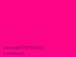Decimal 372790291 Color is a normal rose color and the nearest color is Rose #ff007f. Hex code #fa0585 and RGB value is rgb(250,5,133). In RGB color space, this color is composed of 98% red, 2% green, 52% blue, In CMYK color space, this color is composed of 0% cyan, 98% magenta, 47% yellow , 2% black , In HSL color space, this color has a hue angle of 329° , 96% saturation and 50% lightness.