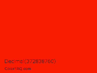 Decimal 372838760 Color is a normal red color and the nearest color is Scarlet #ff2400. Hex code #fa1c00 and RGB value is rgb(250,28,0). In RGB color space, this color is composed of 98% red, 11% green, 0% blue, In CMYK color space, this color is composed of 0% cyan, 89% magenta, 100% yellow , 2% black , In HSL color space, this color has a hue angle of 7° , 100% saturation and 49% lightness.