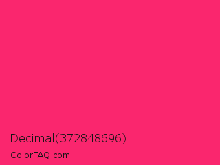 Decimal 372848696 Color is a normal rose color and the nearest color is Radical Red #ff355e. Hex code #fa266e and RGB value is rgb(250,38,110). In RGB color space, this color is composed of 98% red, 15% green, 43% blue, In CMYK color space, this color is composed of 0% cyan, 85% magenta, 56% yellow , 2% black , In HSL color space, this color has a hue angle of 340° , 95% saturation and 56% lightness.