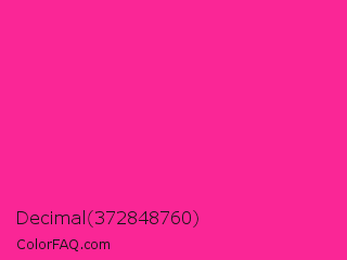 Decimal 372848760 Color is a normal rose color and the nearest color is Persian Rose #fe28a2. Hex code #fa2696 and RGB value is rgb(250,38,150). In RGB color space, this color is composed of 98% red, 15% green, 59% blue, In CMYK color space, this color is composed of 0% cyan, 85% magenta, 40% yellow , 2% black , In HSL color space, this color has a hue angle of 328° , 95% saturation and 56% lightness.