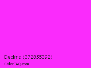 Decimal 372855392 Color is a normal magenta color and the nearest color is Magenta / Fuchsia #ff00ff. Hex code #fa2bfc and RGB value is rgb(250,43,252). In RGB color space, this color is composed of 98% red, 17% green, 99% blue, In CMYK color space, this color is composed of 1% cyan, 83% magenta, 0% yellow , 1% black , In HSL color space, this color has a hue angle of 299° , 97% saturation and 58% lightness.