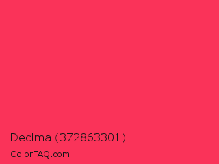 Decimal 372863301 Color is a normal red color and the nearest color is Radical Red #ff355e. Hex code #fa3359 and RGB value is rgb(250,51,89). In RGB color space, this color is composed of 98% red, 20% green, 35% blue, In CMYK color space, this color is composed of 0% cyan, 80% magenta, 64% yellow , 2% black , In HSL color space, this color has a hue angle of 349° , 95% saturation and 59% lightness.