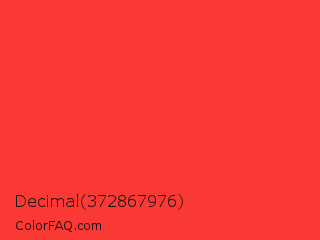 Decimal 372867976 Color is a normal red color and the nearest color is Red Orange #ff3f34. Hex code #fa3834 and RGB value is rgb(250,56,52). In RGB color space, this color is composed of 98% red, 22% green, 20% blue, In CMYK color space, this color is composed of 0% cyan, 78% magenta, 79% yellow , 2% black , In HSL color space, this color has a hue angle of 1° , 95% saturation and 59% lightness.