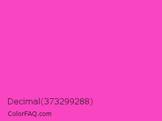 Decimal 373299288 Color is a light magenta color and the nearest color is Razzle Dazzle Rose #ff33cc. Hex code #fa45c2 and RGB value is rgb(250,69,194). In RGB color space, this color is composed of 98% red, 27% green, 76% blue, In CMYK color space, this color is composed of 0% cyan, 72% magenta, 22% yellow , 2% black , In HSL color space, this color has a hue angle of 319° , 95% saturation and 63% lightness.