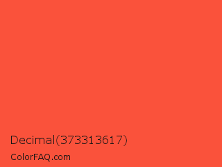 Decimal 373313617 Color is a light red color and the nearest color is Ogre Odor #fd5240. Hex code #fa523b and RGB value is rgb(250,82,59). In RGB color space, this color is composed of 98% red, 32% green, 23% blue, In CMYK color space, this color is composed of 0% cyan, 67% magenta, 76% yellow , 2% black , In HSL color space, this color has a hue angle of 7° , 95% saturation and 61% lightness.