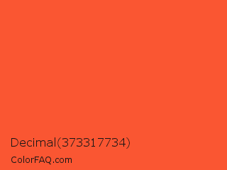 Decimal 373317734 Color is a normal red color and the nearest color is Portland Orange #ff5a36. Hex code #fa5632 and RGB value is rgb(250,86,50). In RGB color space, this color is composed of 98% red, 34% green, 20% blue, In CMYK color space, this color is composed of 0% cyan, 66% magenta, 80% yellow , 2% black , In HSL color space, this color has a hue angle of 11° , 95% saturation and 59% lightness.