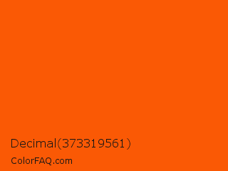 Decimal 373319561 Color is a normal orange color and the nearest color is Willpower Orange #fd5800. Hex code #fa5905 and RGB value is rgb(250,89,5). In RGB color space, this color is composed of 98% red, 35% green, 2% blue, In CMYK color space, this color is composed of 0% cyan, 64% magenta, 98% yellow , 2% black , In HSL color space, this color has a hue angle of 21° , 96% saturation and 50% lightness.