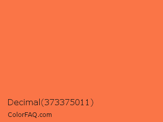Decimal 373375011 Color is a light color and the nearest color is Mandarin #f37a48. Hex code #fa7547 and RGB value is rgb(250,117,71). In RGB color space, this color is composed of 98% red, 46% green, 28% blue, In CMYK color space, this color is composed of 0% cyan, 53% magenta, 72% yellow , 2% black , In HSL color space, this color has a hue angle of 15° , 95% saturation and 63% lightness.