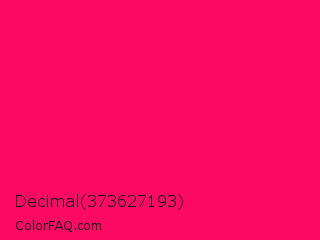 Decimal 373627193 Color is a normal rose color and the nearest color is Vivid Raspberry #ff006c. Hex code #fb0963 and RGB value is rgb(251,9,99). In RGB color space, this color is composed of 98% red, 4% green, 39% blue, In CMYK color space, this color is composed of 0% cyan, 96% magenta, 61% yellow , 2% black , In HSL color space, this color has a hue angle of 338° , 97% saturation and 51% lightness.